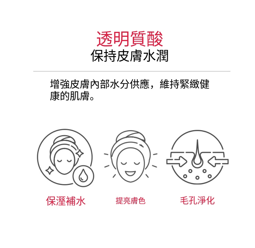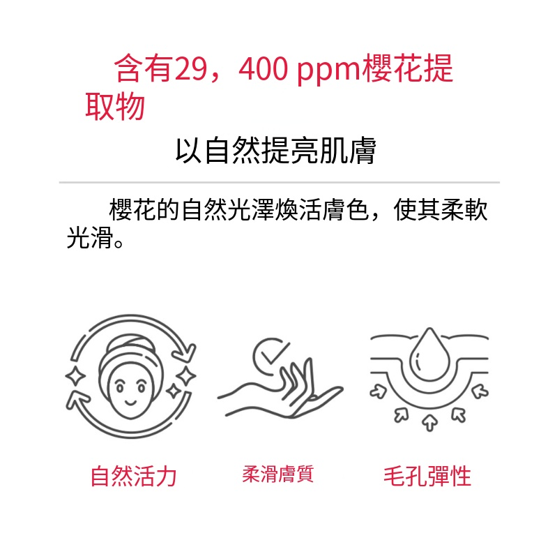 含有由超低分子、高分子組成的覆合玻尿酸成分和櫻花提取物,為深層肌膚補充水分,打造富有生機的肌膚