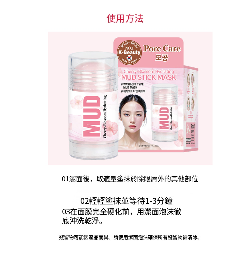 1.潔面後,取適量泥面膜塗於臉部(眼睛及嘴唇除外)。