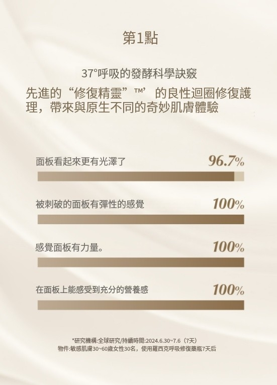 經過14天的使用,皮膚改善滿意度達到90%以上,推薦率優越的再生和修復功能,